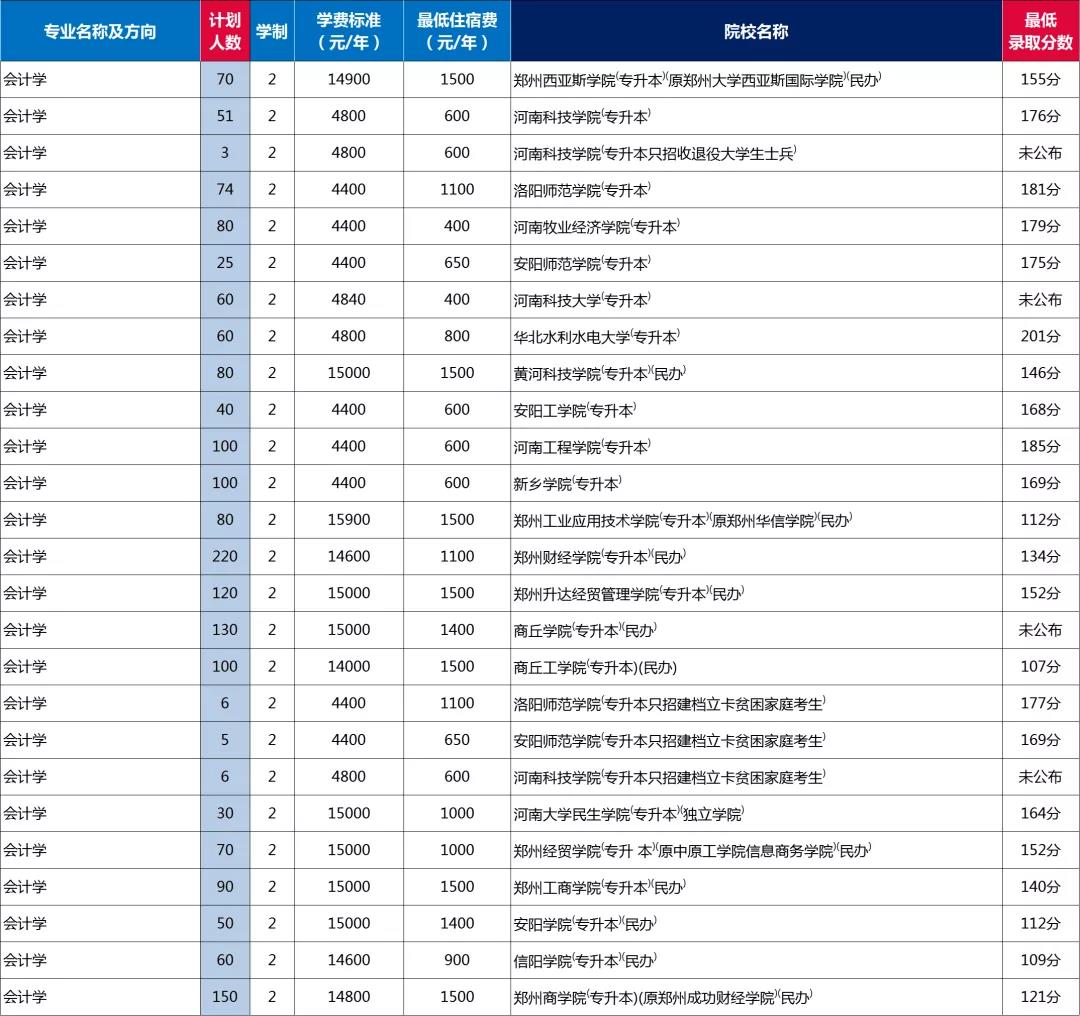 2020年会计专业招生院校共22所,招生人数共计1860人,会计专业可以选择的公办院校有:华北水利水电大学、河南工程学院、河南牧业经济学院、河南科技学院、新乡学院、安阳工学院、洛阳师范学院、洛阳师范学院、安阳师范学院、安阳师范学院、河南科技大学,民办院校有郑州西亚斯学院、郑州经贸学院、郑州升达经贸管理学院、黄河科技学院、郑州财经学院、郑州工商学院、商丘工学院、安阳学院、郑州商学院、郑州工业应用技术学院、商丘学院、河南大学民生学院、信阳学院。2021年会计学专业招生院校还未发布,2020年的会计学招生院校仅供同学们参考。