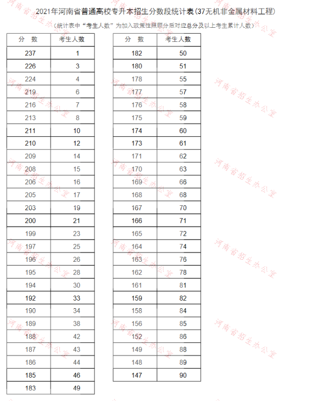 2021年河南专升本无机非金属材料工程专业省控线是147分,最高分237分,上线人数是90人,计划人数是75人。