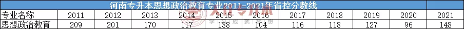 河南专升本思想政治教育专业2011年的省控线是最高的,达到了209分,2021年的省控线是148分。