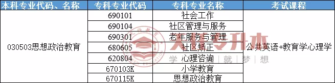 专科学什么专业的同学,专升本可以选思想政治教育专业,主要有:社会工作、社区管理与服务、老年服务与管理、社区矫正、心理咨询、小学教育、思想政治教育,可以参照下表: