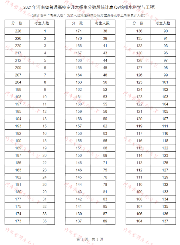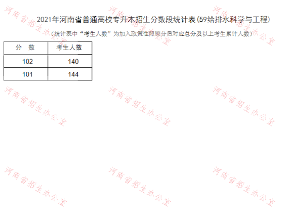 2021年河南专升本给排水科学与工程招生分数段统计表