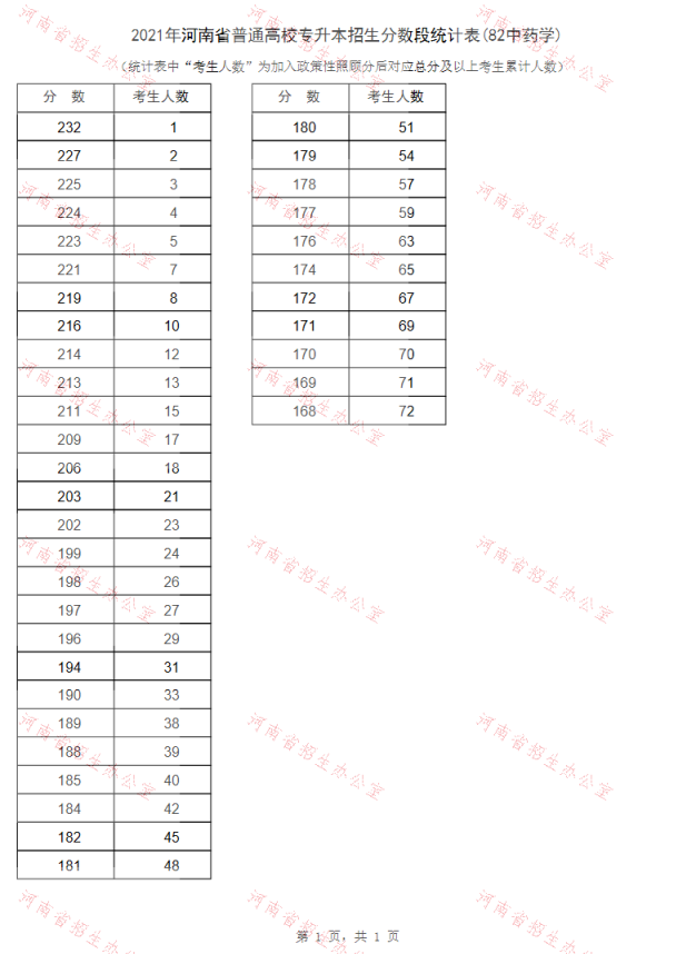 2021年河南专升本中药学招生分数段统计表