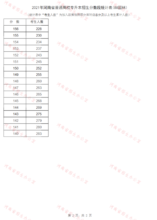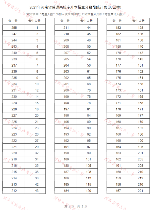 2021年河南专升本园林专业招生分数段统计表