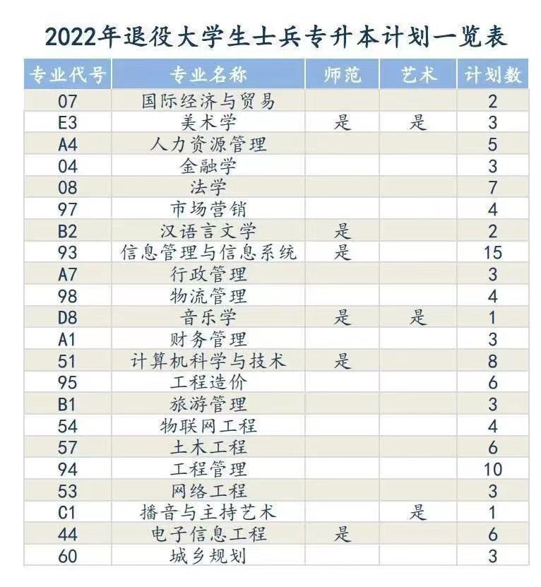 安阳学院2022年专升本退役大学生士兵招生计划