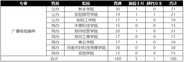 以上就是天任专升本小编整理的广播电视编导专业招生计划,今年广播电视编导专业共有9所院校招生,其中3所公办院校,6所民办院校,共计招生186人,想了解更多升本咨询请关注招生计划栏目进行查询,祝大家在考试中取得高分。