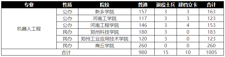 以上就是天任专升本小编整理的机器人工程专业招生计划,今年机器人工程专业共有6所院校招生,其中3所公办院校,3所民办院校,共计招生1005人,想了解更多升本咨询请关注招生计划栏目进行查询,祝大家在考试中取得高分。