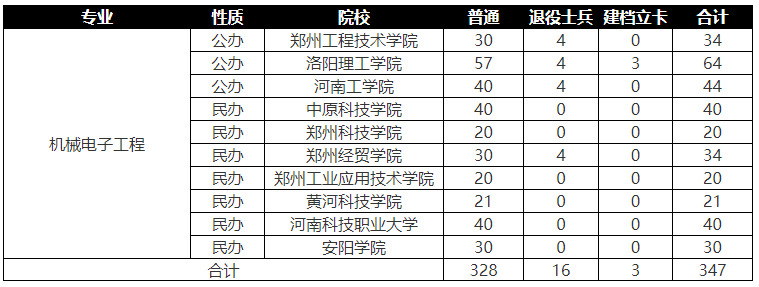 以上就是天任专升本小编整理的机械电子工程专业招生计划,今年机械电子工程专业共有10所院校招生,其中3所公办院校,7所民办院校,共计招生347人,想了解更多升本咨询请关注招生计划栏目进行查询,祝大家在考试中取得高分。