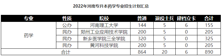 2022年河南专升本已经结束,今年药学专业共有4所院校招生,其中1所公办院校,3所民办院校,共计招生890人,下面是天任专升本小编给考生整理汇总了药学专业的招生情况,供23年考试的同学们提前参考,具体情况如下: