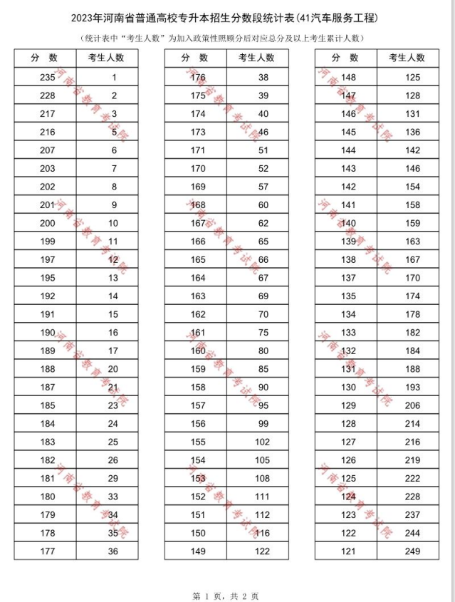 2023年河南专升本汽车服务工程专业一分一段表