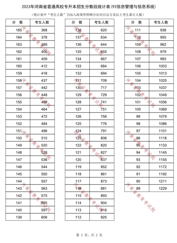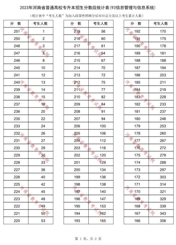 2023年河南专升本信息管理与信息系统专业一分一段表