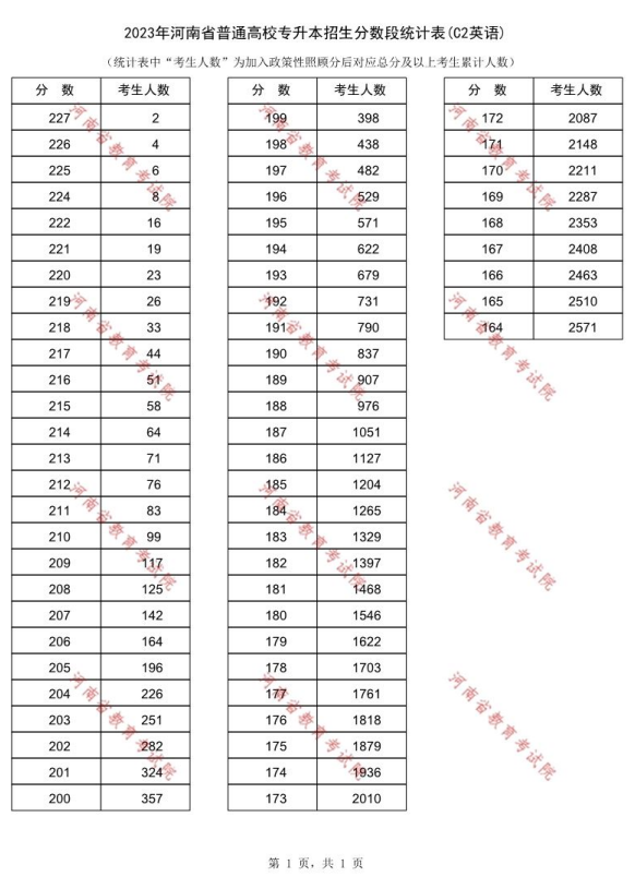 2023年河南专升本英语专业一分一段表