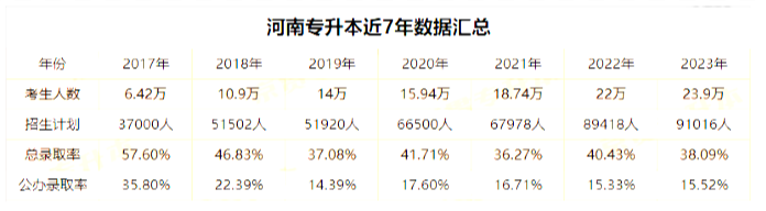 下表为河南专升本近7年的数据汇总,大家可以直白地感受到“专升本扩招”在招生数量上的变化。