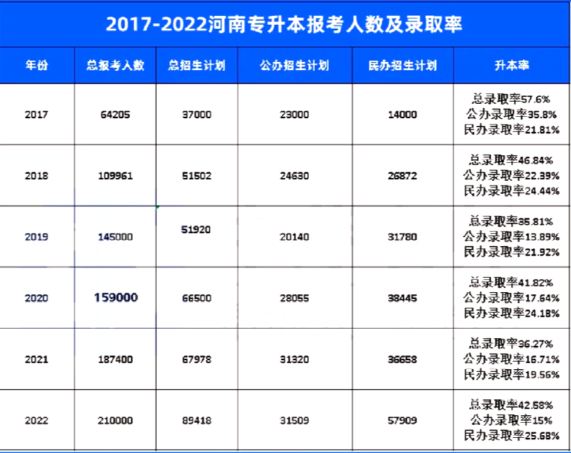 从近些年的数据来看,河南专升本的平均录取率大约40%,基本5个人考专升本,就有2个人能够被录取。这样看上去,专升本考试真的不难任何一场大型的选拔性考试,都不会有这么高的录取率。就连教师资格证、二级建造师等通过性考试,录取率也只有20%~30%。更别说国考、法考这种骨灰级难度的考试了。