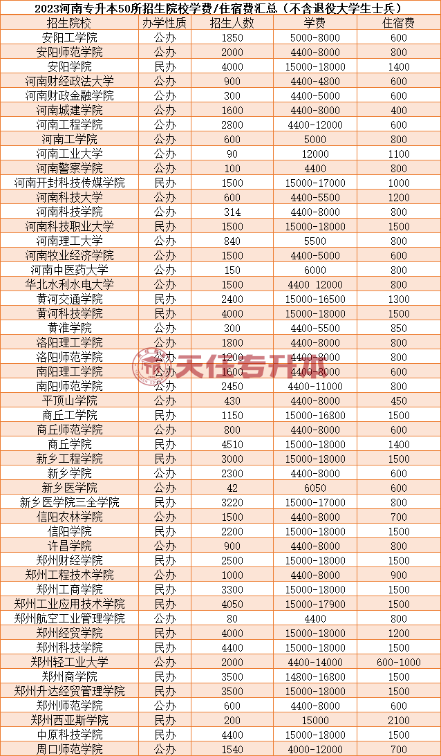 以上就是关于“河南省专升本一般学费多少钱一年?”简要介绍了,希望大家河南专升本考试能够取得自己心仪的成绩。如有更多想要知道河南专升本常见问题的相关资讯,如专升本招生学校、考试动态、考试科目、招生专业等。敬请关注天任专升本!