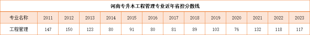 河南专升本工程管理专业2012年的省控线比较高,达到150分,2020年的省控线比较低,达到76分。