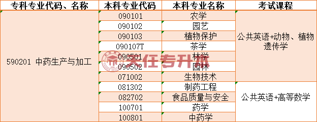 专科读中药生产与加工专业,专升本可以学哪些专业?中药生产与加工专业专升本对应的本科专业是农学、 园艺、 植物保护、茶学、 林学、 园林、 生物技术、 制药工程、 食品质量与安全、 药学、 中药学。