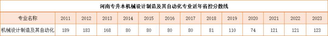 河南专升本机械设计制造及其自动化专业2011年的省控线比较高,达到189分,2014年-2017年的省控线比较低,达到80分。