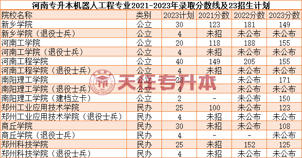 2023年河南专升本机器人工程专业共招生228人,具体院校录取分数线如下: