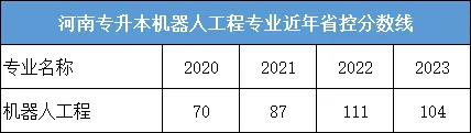 河南专升本机器人工程专业是新专业,2020年开始招生,省控线不是太高,这两年分数在七八十分左右,2023年104分。