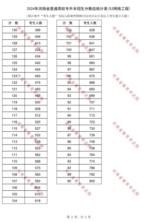 2024年河南专升本网络工程专业一分一段表