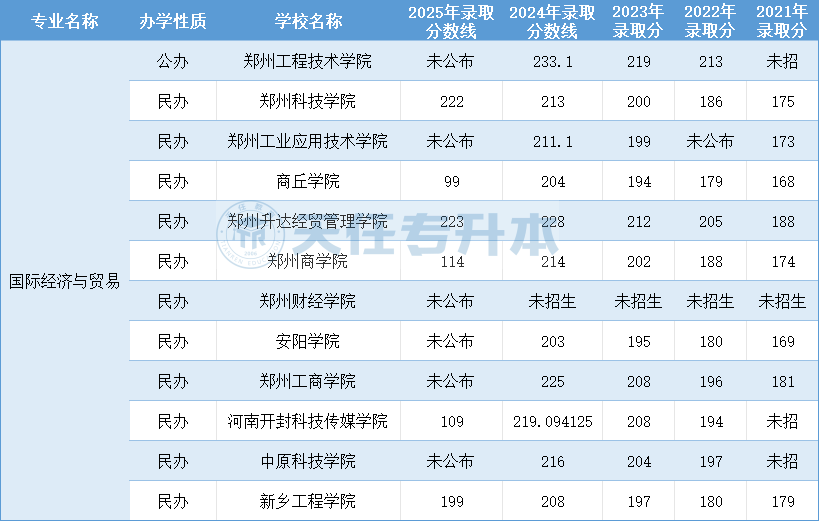 河南专升本国际经济与贸易2021-2025年录取分数线