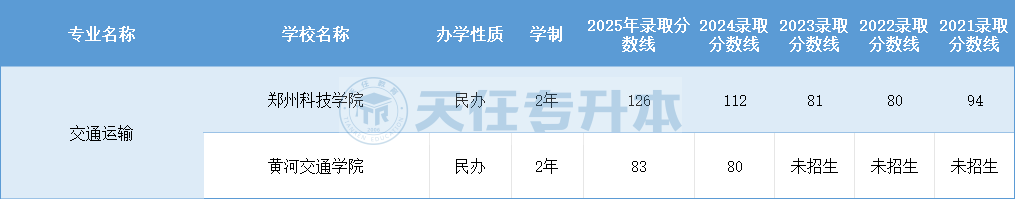 河南专升本交通运输2021-2025年录取分数线