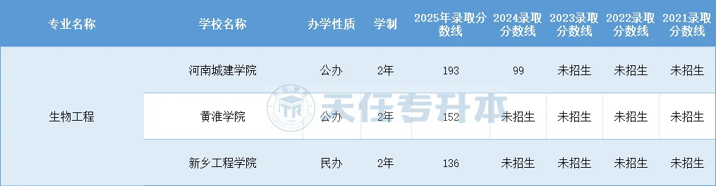河南专升本生物工程2021-2025年录取分数线