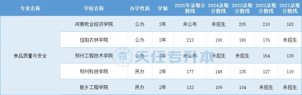 河南专升本食品质量与安全2021-2025年录取分数线
