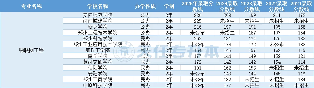 河南专升本物联网工程2021-2025年录取分数线