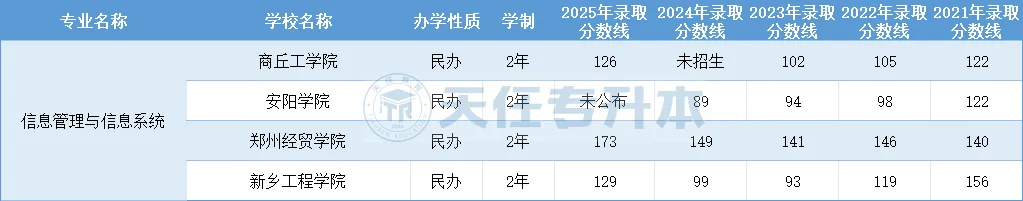 河南专升本信息管理与信息系统2021-2025年录取分数线