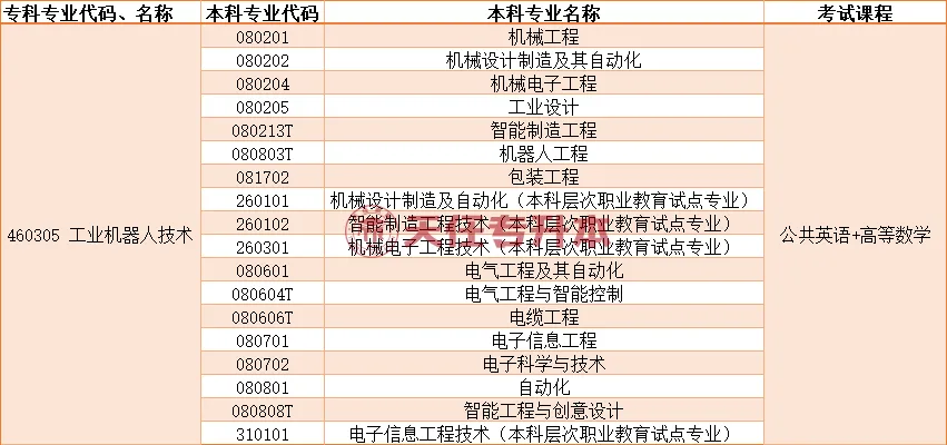工业机器人技术专升本选择的本科专业有这些:机械工程、机械设计制造及其自动化、机械电子工程、工业设计、智能制造工程、机器人工程、包装工程、机械设计制造及自动化(本科层次职业教育试点专业)、智能制造工程技术(本科层次职业教育试点专业)、机械电子工程技术(本科层次职业教育试点专业)、电气工程及其自动化、电气工程与智能控制、电缆工程、电子信息工程、电子科学与技术、自动化、智能工程与创意设计、电子信息工程技术(本科层次职业教育试点专业),这些专业的考试内容是公共英语和高等数学。