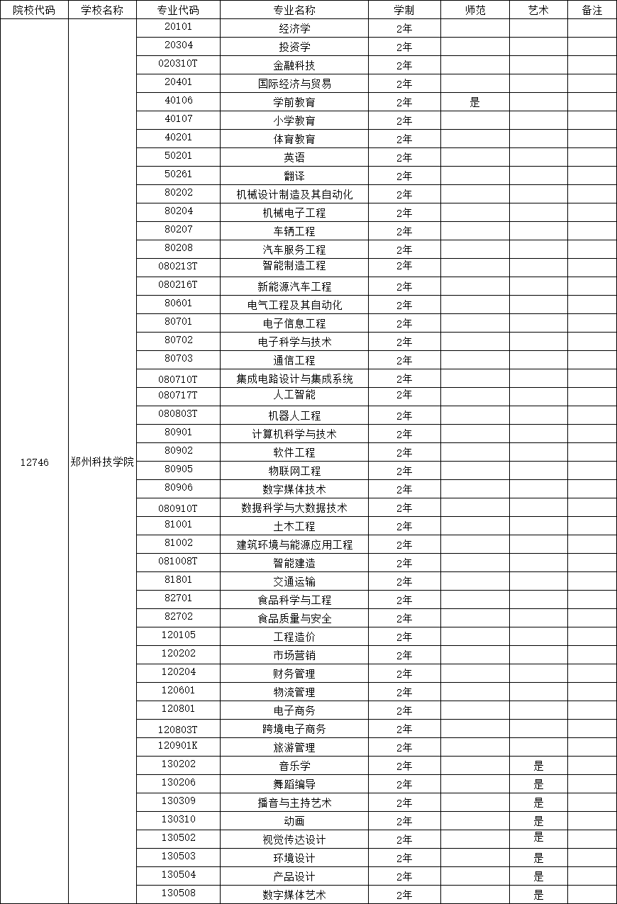 郑州科技学院2026年专升本招生专业