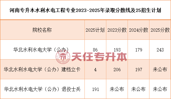 2025年水利水电工程专业,1所院校招生,1所院校还是公办院校,招生人数共计281人,普通考生86人,建档立卡考生4人,退役大学生士兵191人,普通考生最低录取分是243分,下图是水利水电工程专业2023年-2025年最低录取分数线。