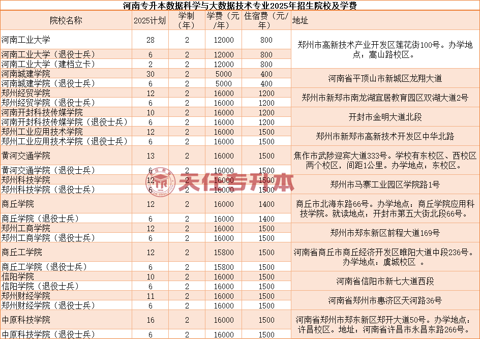 河南专升本数据科学与大数据技术专业2025年具体学费
