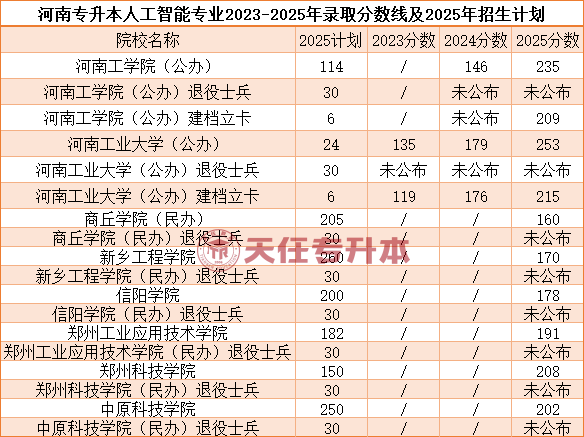 2025年河南专升本人工智能专业招生人数1637人,普通考生招生人数1385人,退役士兵招生人数240人,建档立卡12人。