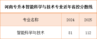 以下是河南专升本智能科学与技术专业近几年的省控线,2024年的省控线比较低,达到81分,2025年的省控线是112分。