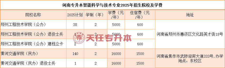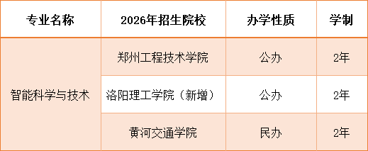 2025年河南专升本智能科学与技术专业共招生182人,招生院校2所,1所公办院校,1所民办院校。