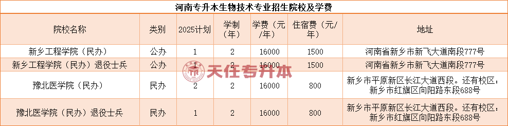 河南专升本生物技术专业2025年具体学费信息如下: